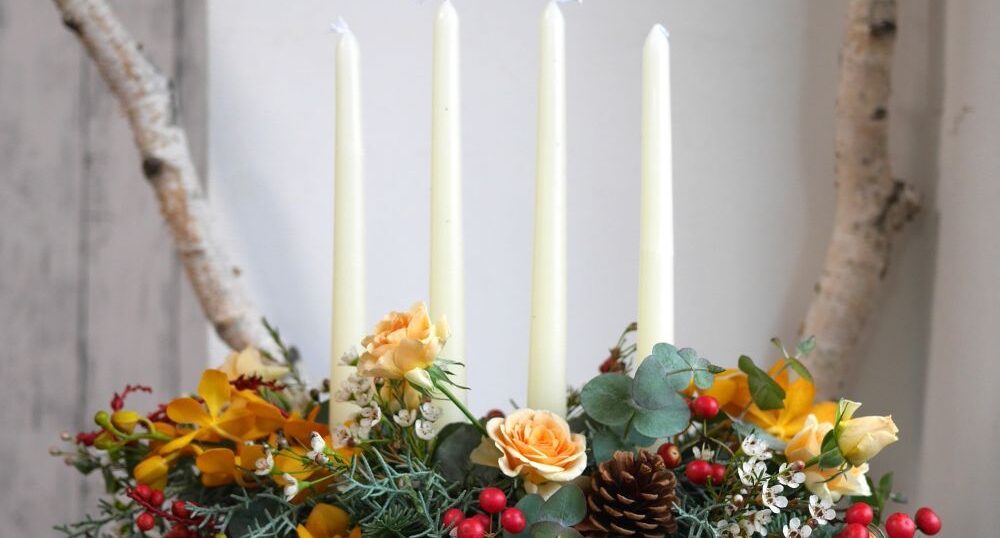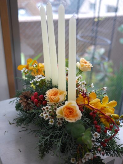 12月季節の花コースは「クリスマス キャンドルアレンジメント」です。