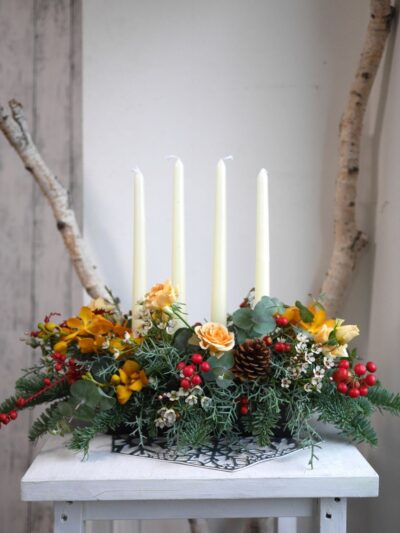 〈手順〉 吸水性スポンジを花器より2~3㎝くらい高くし器にセットする⇒キャンドルをセットする⇒ ホリゾンタルの骨格を作る(モミ)⇒花材を配置(メイン→サブ)⇒実もの・オーナメントを入れる⇒仕上げ *器は横長の花器をお勧めします。(キャンドルを4本立てられる)リース形の器もOK、大き目の丸でもOK!
