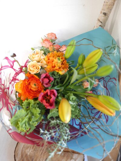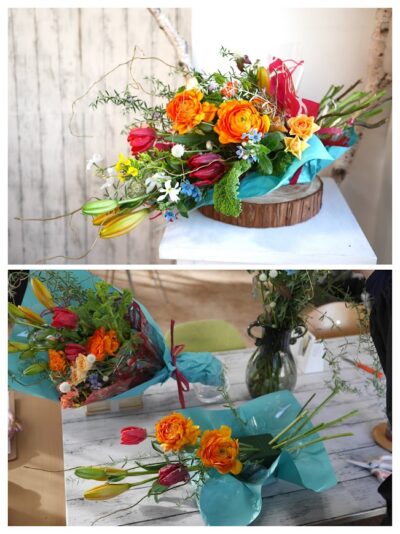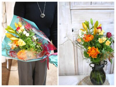 花束を2つに分けてプレゼント用に、伸びやかにお店に飾る花束に