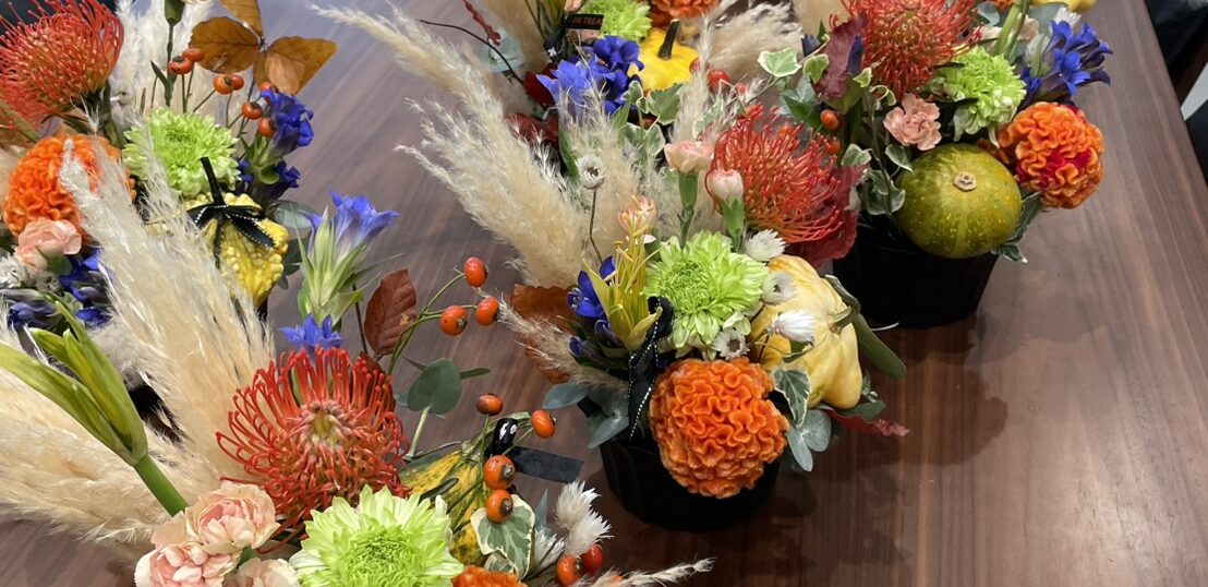 今回もハロウィンパーティーに飾ると盛り上がるアレンジメントになりました。